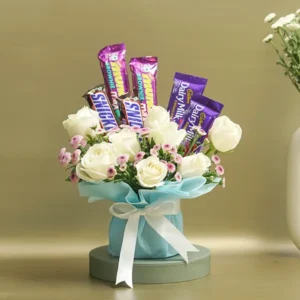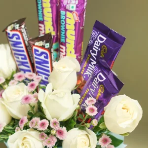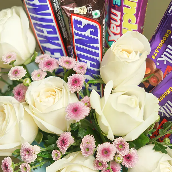 This judicious Floraindia package brings you a floral arrangement of white roses and purple daisies along with a thoughtfully assembled chocolate hamper that gets you a perfect equilibrium of different chocolate tastes and textures like crunchy fruit and nut, refined Snickers and crispy munch. This package is a perfect gift for joyous occasions and a thoughtful present for expressing your love, reverence, or sweetly surprising your loved ones.