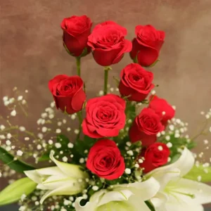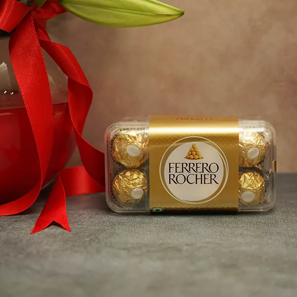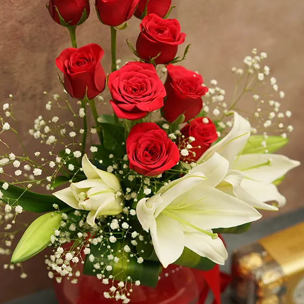 This is an attractive and beautiful arrangement of 10 Deep Red Roses and 3 oriental lilies in a glass bowl and a box of Ferrero Rocher Chocolates 16 Pcs. along with a Valentines Greeting card just like your true and deep feelings for dear ones. Send this Deep Rosy Emotions amazingly designed online gift for your beloved and let them know your heart’s gratefulness for them.