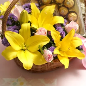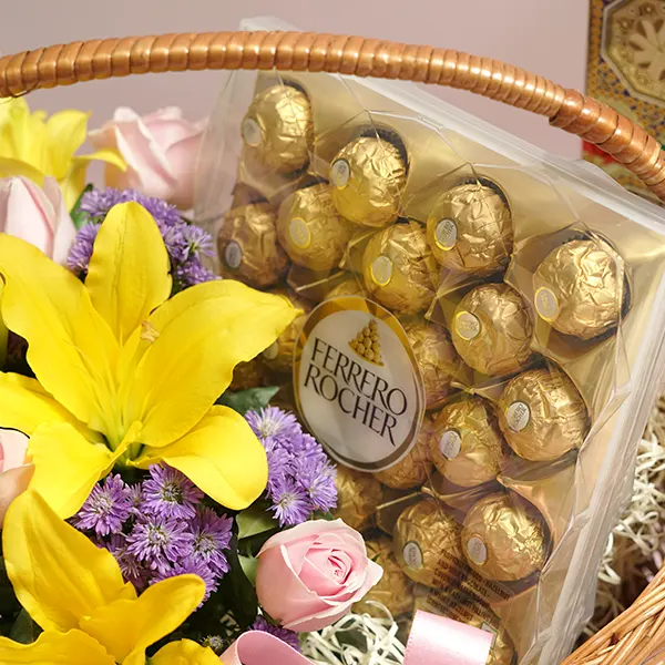 Gift an ideal package of delicious joy, health, and vibrant, beautiful blooms with this mindful Floraindia combo. This gift set offers your loved ones a vibrant blend of fresh yellow lilies, pink roses, and purple chrysanthemums with a delicious Ferrero Rocher box and a kg of dry fruits to convey to your dearest ones, “You matter.” This gift set is an ideal one gifting on Birthdays, anniversaries, Congratulations, or housewarming ceremonies.