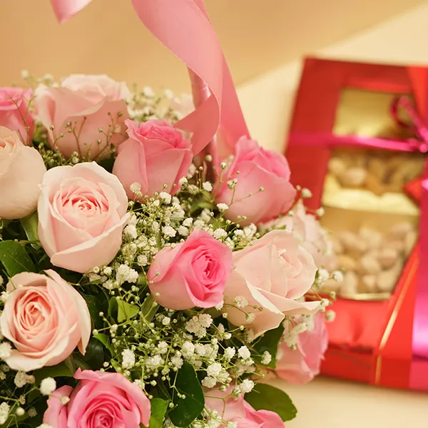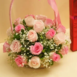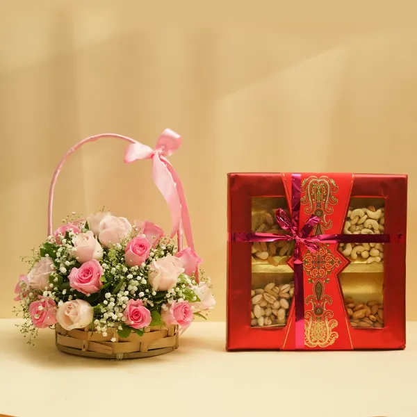 Our Love Perfection with Assorted Dry Fruits package gets you the exclusive arrangement of two dozen pink roses with healthful dry fruits. The floral assortment of pink and baby pink roses, along with delicate Gypsophila flowers, comes decorated in an exquisite bamboo basket with a handle and decorated with a pink ribbon. The premium crunchy and flavorful dry fruits bring you taste and flavor, and the personal message card expresses grace and care, making this package a perfect gift for any occasion.