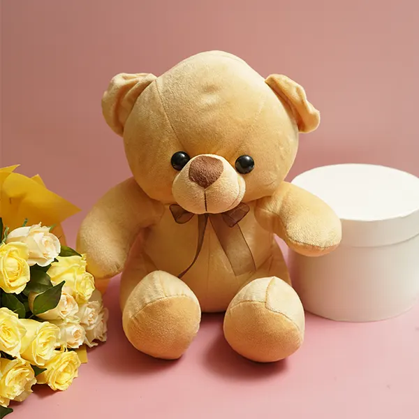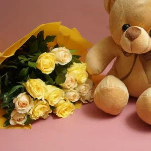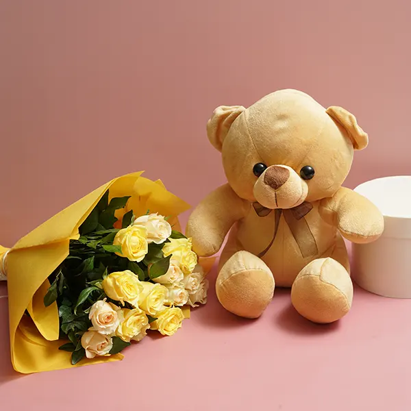 Warm the hearts of your nearest and dearest ones with our bright and snuggly gift combo of yellow roses and teddy bear. Celebrate the happiness of friendship and togetherness with our cheerful bouquet of yellow roses, accentuated with seasonal green foliage, encased in a yellow sunshine tone, and paired up thoughtfully with our twelve-inch cuddly teddy bear. This is an ideal gift combo for celebrating friendship, expressing thank you, get well soon, or congratulations to your besties.